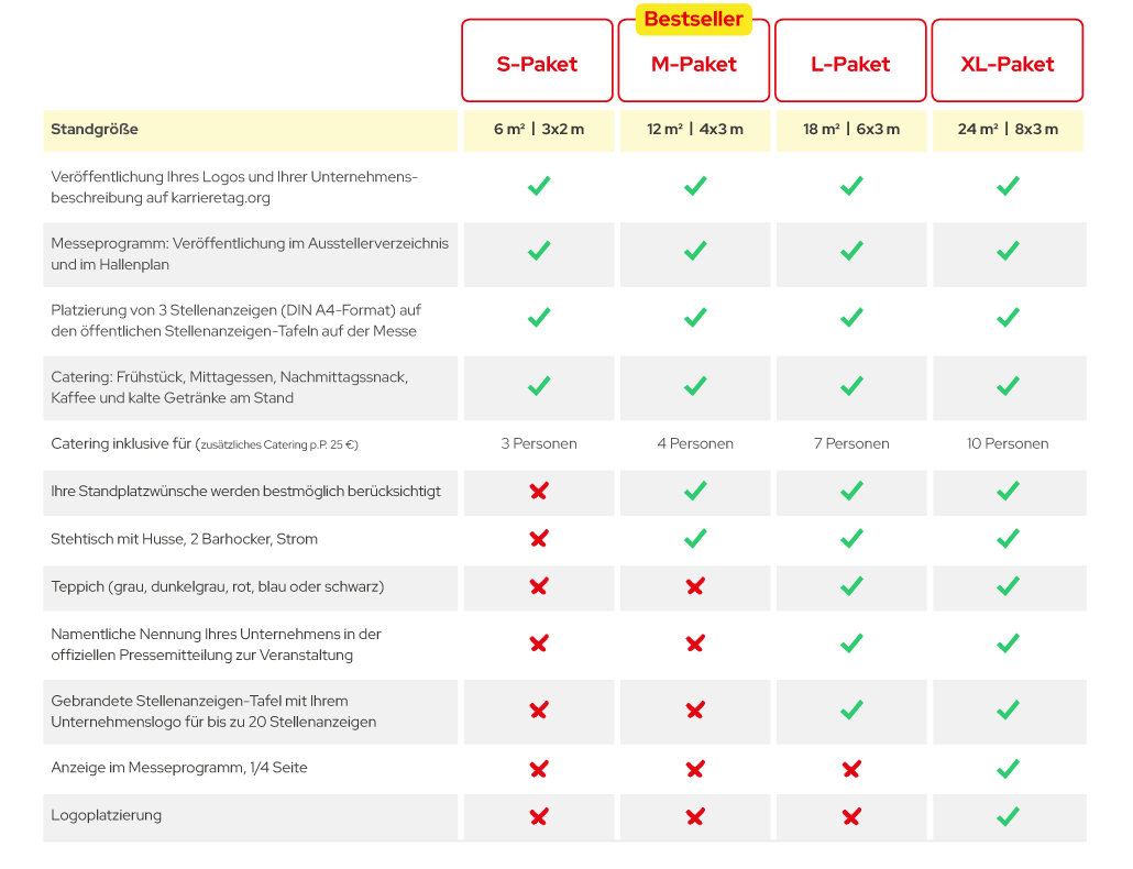 Auf jeder Jobmesse bieten wir Messestände in den vier verschiedenen Größen S, M, L und XL an. Jedes Messepaket beinhaltet die Standfläche und einen WLAN-Zugang. Die unterschiedlichen Pakete beinhalten dann jeweils unterschiedliche Inklusivleistungen: