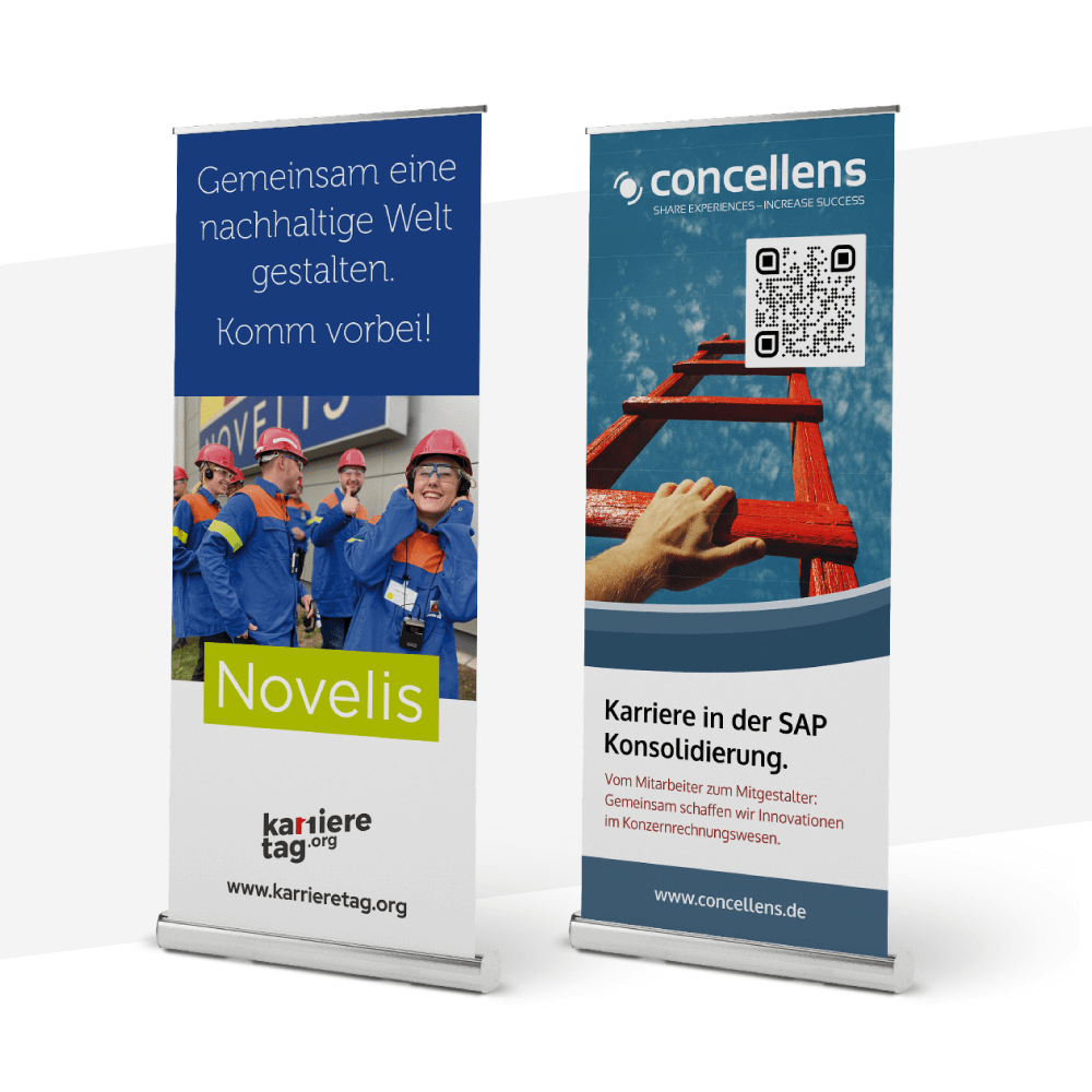 Ihr Roll-Up wird gut sichtbar im Eingangsbereich oder an zentraler Stelle auf der Messefläche platziert – je nach örtlicher Gegebenheit. Darstellung in Ihrem Unternehmensdesign inkl. Logo. Nach dem Karrieretag geht das Roll-Up in Ihren Besitz über.